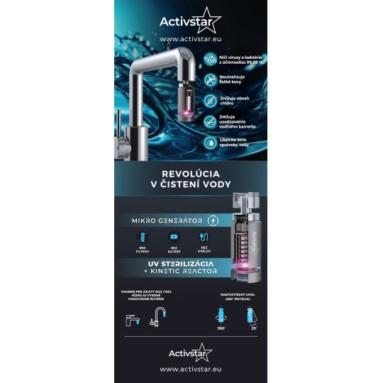 je revoluční produkt určený k čištění vody, který kombinuje 2 technologie – sterilizaci vody prostřednictvím UVC a UVA paprsků a čištění vody s využitím Kinetic Reactora. Produkt je vybaven otočným kloubem. Snadno nasměrujete proud vody požadovaným směrem. Instalace je velmi jednoduchá. Stačí odmontovat váš klasický perlátor (koncovku vodovodní baterie) a namísto něj namontovat Activstar reactor.