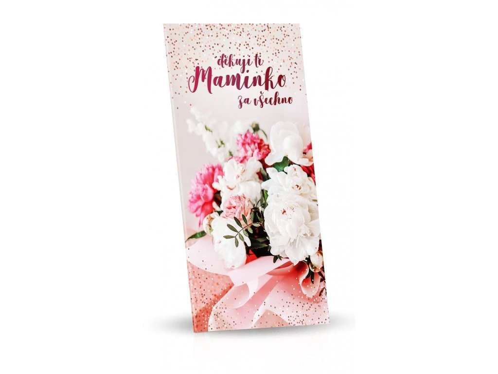Vyjádřete svou lásku a vděčnost sladkou pozorností. Tato výběrová belgická mléčná čokoláda s jemnou chutí potěší každou maminku – nejen svým lahodným složením, ale i krásným designem obalu. Elegantní pugét pivoněk a nápis „Děkuji, maminko za všechno“ dělají z této čokolády ideální dárek ke Dni matek nebo jen tak, pro radost.