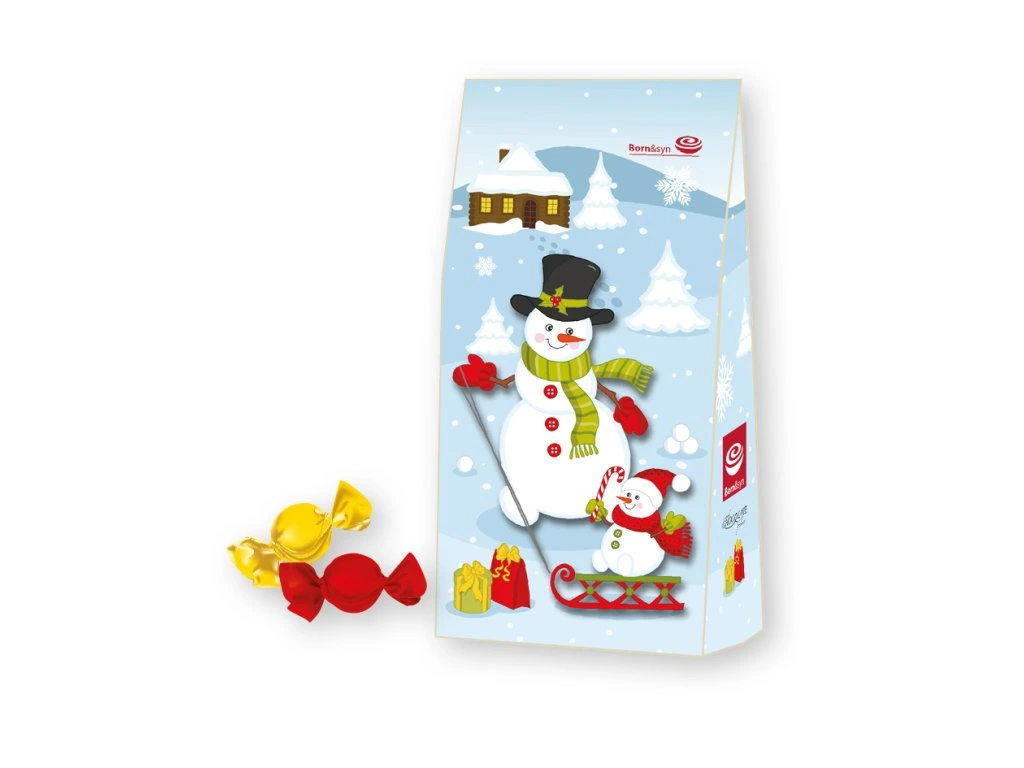 Pralinky z mléčné čokolády v krásném balení s motivem sněhuláka