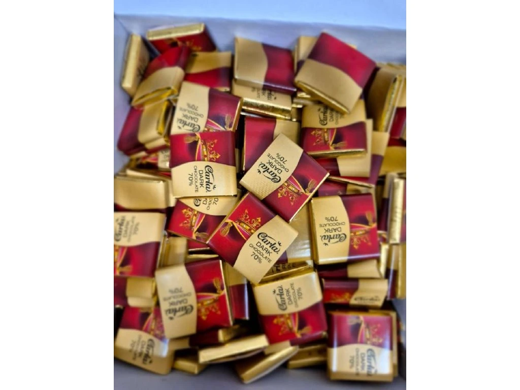 Malé hořké čokoládky v červenozlatém designu potěší chutí v dárkovém kornoutu, balíčku, jako sladkost ke kávě. Čokoládky jsou vložené do bílé krabice
