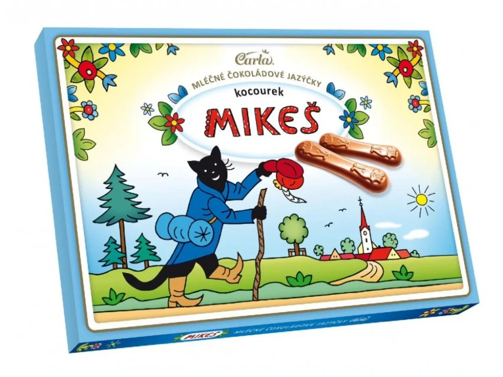 Potěšte děti lahodnou čokoládou od Carly. Mléčné čokoládové jazýčky v dárkovém balení s kocourkem Mikešem budou krásným dárkem i milou pozorností.Kocourek Mikeš jako typicky česká ladovská postavička Vás bude těšit okem i chutí