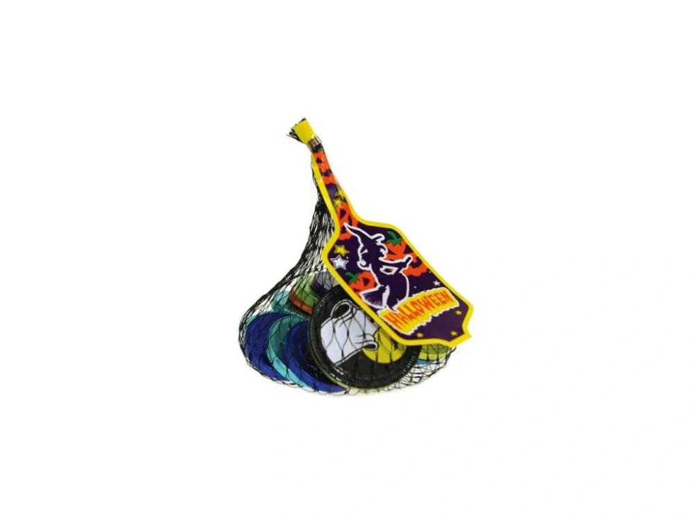 Strašidelné čokoládové mince. Mince jsou různě barevné a mají vytlačený obrázek čarodějnice, nápisu halloween a dýně