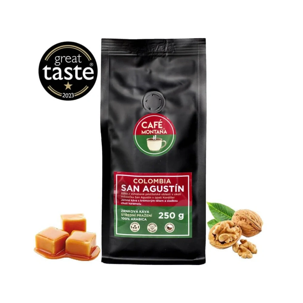 Káva z vyhlášené pěstitelské oblasti v okolí městečka San Agustín v úpatí mohutných Kordiller v Kolumbii zaujme jemným krémovým tělem. Ucítíte v ní sladkou chuť karamelu a oříšků.
