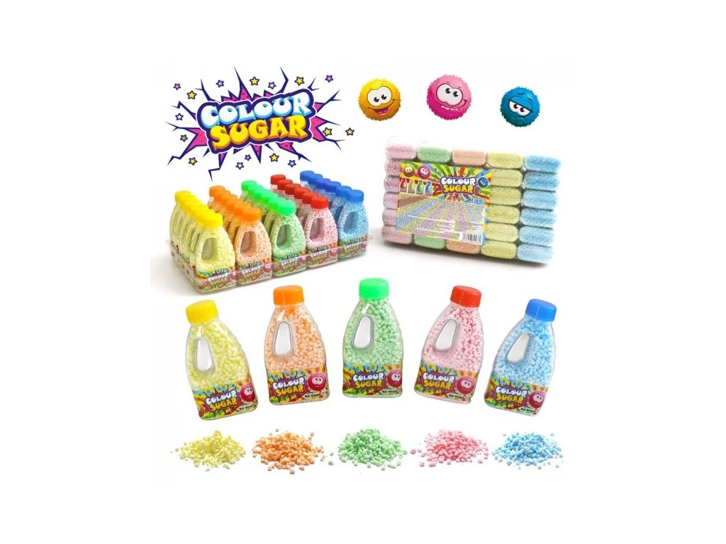 Pět druhů barevných lahviček naplněných sladkým práškem ve stejné barvě lahvičky. Děti potěší tato sladká cukrovinka