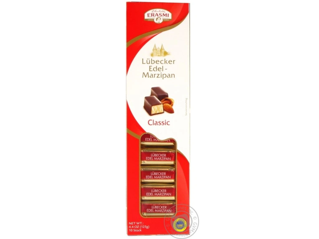 Vychutnejte si prémiový líbecký marcipán od značky Erasmi, který je známý svou jemnou strukturou a vysokým obsahem mandlí. Každý kousek je jednotlivě balen, aby si uchoval svou čerstvost a jedinečnou chuť. Díky elegantnímu dárkovému balení je tato pochoutka skvělou volbou pro milovníky marcipánu i jako sladký dárek.