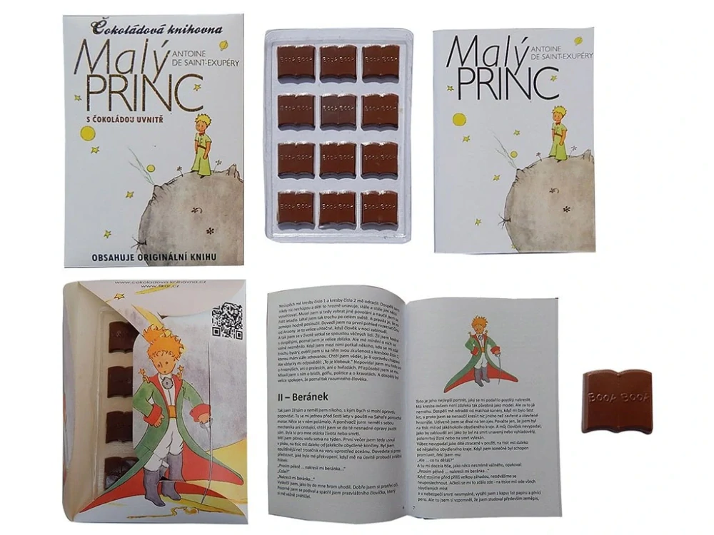 - obsahuje: knihu Malý princ (52 stran) dle originálu, 12 čokoládek ve tvaru knihy s reliéfem