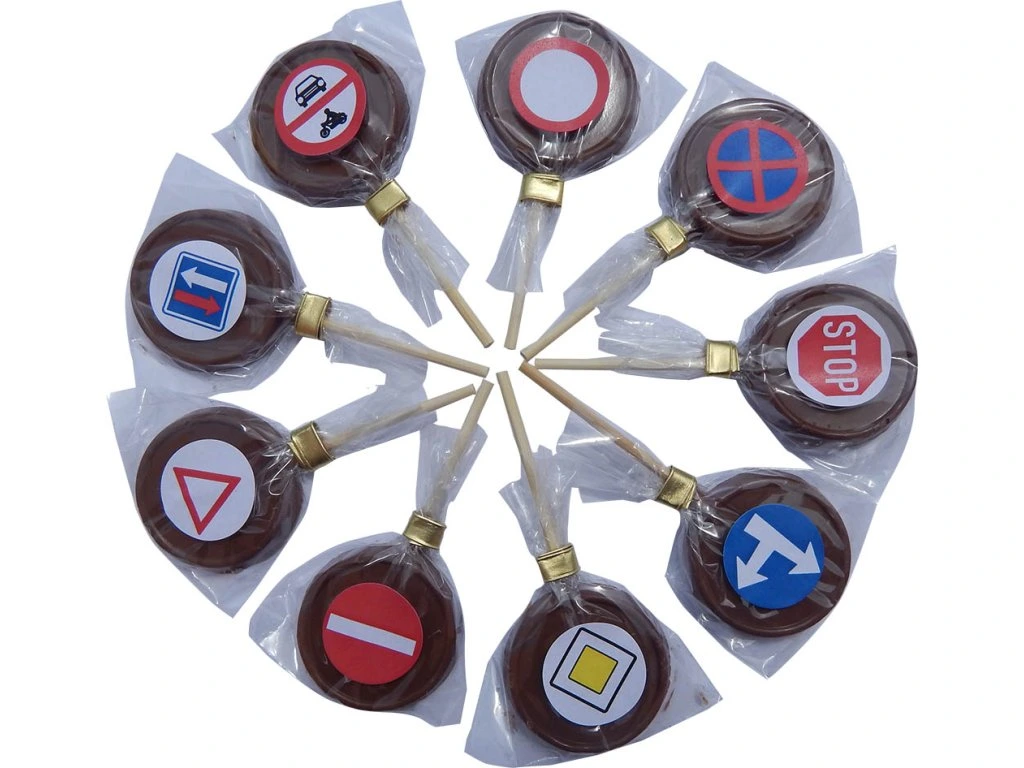 Čokoládové lízátko v obalu s motivem dopravních značek. Značky mix dle skladové dostupnosti