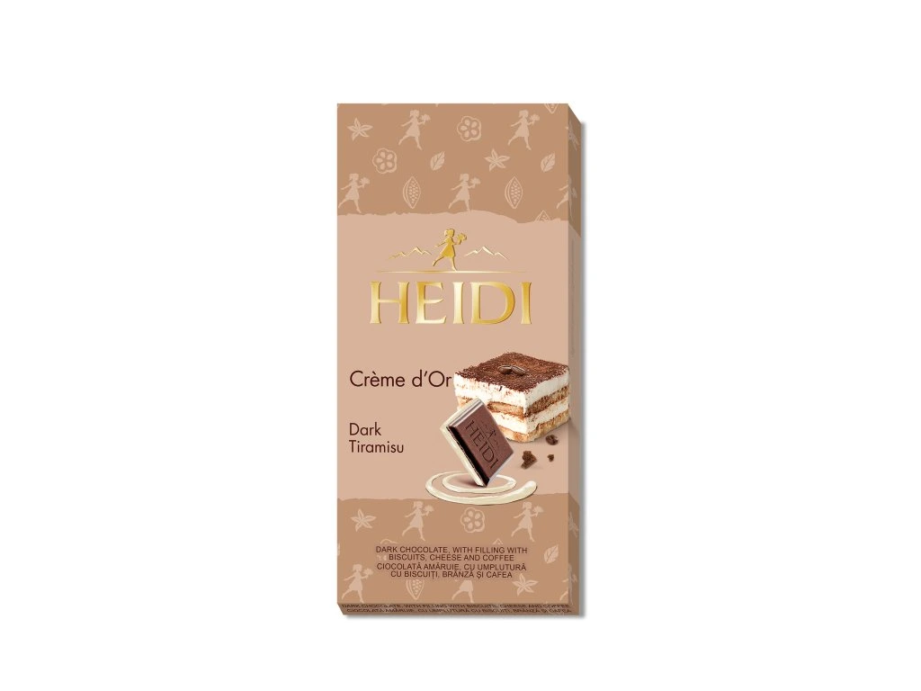 Zažijte neodolatelný chuťový zážitek s čokoládou Heidi Créme D’Or Tiramisu – vytříbenou kombinací jemné hořké čokolády a bohaté krémové náplně s tóny kávy a sušenek, inspirované tradičním italským dezertem tiramisu. Tato prémiová čokoláda přináší dokonalou rovnováhu mezi výraznou chutí kvalitního kakaa a sladce krémovým středem s kávovou notou. Je ideální volbou pro všechny, kteří hledají sladkost s nádechem elegance a sofistikovanosti.