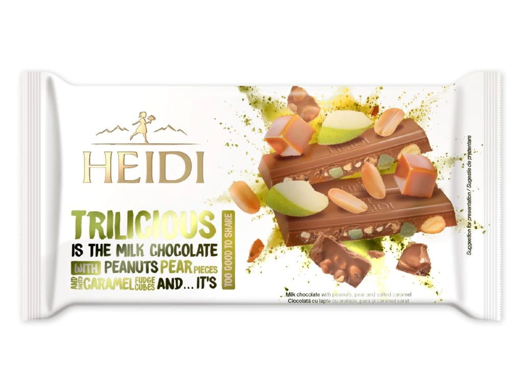 Hledáte mléčnou čokoládu plnou ovoce a oříšků? Šáhněte po této nové Heidi. Kvalitní mléčná čokoláda obsahuje kousky šťavnaté hrušky, arašídy a kousky slanného karamelu. Tuto čokoládu můžete dát jako dárek, pokud ji tedy dřív nesníte.