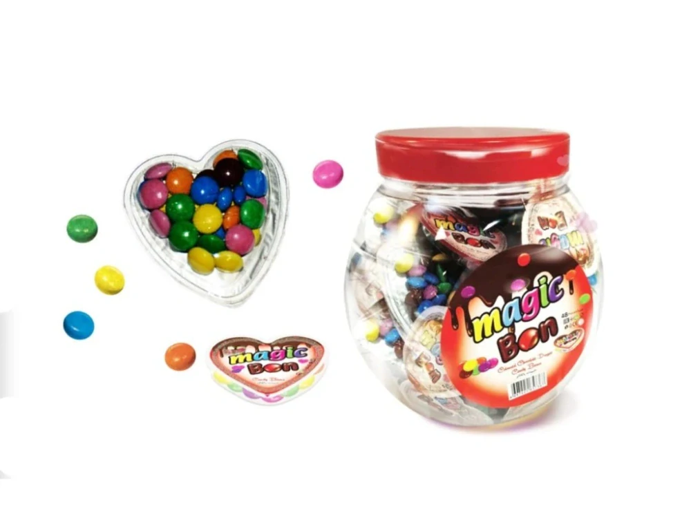 Potěšte své blízké roztomilým a sladkým překvapením! Magic Bon přináší plastová srdíčka plněná lahodnými čokoládovými dražé bonbony v různých veselých barvách. Každé balení obsahuje 10 g křupavých bonbonů s jemnou mléčnou čokoládou uvnitř. Perfektní jako drobný dárek, sladká odměna nebo veselý doplněk k dárkovému balíčku. Barevné dražé potěší děti i dospělé a praktické balení ve tvaru srdce dodá kouzlo každé příležitosti.