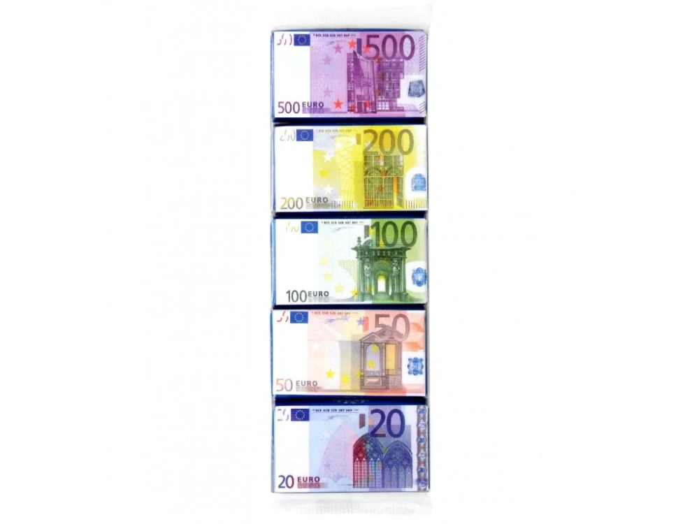 Pět kusů mléčných čokoládek s motivy Euro bankovek. Darujte vtipnou čokoládu v podobě euro peněz.