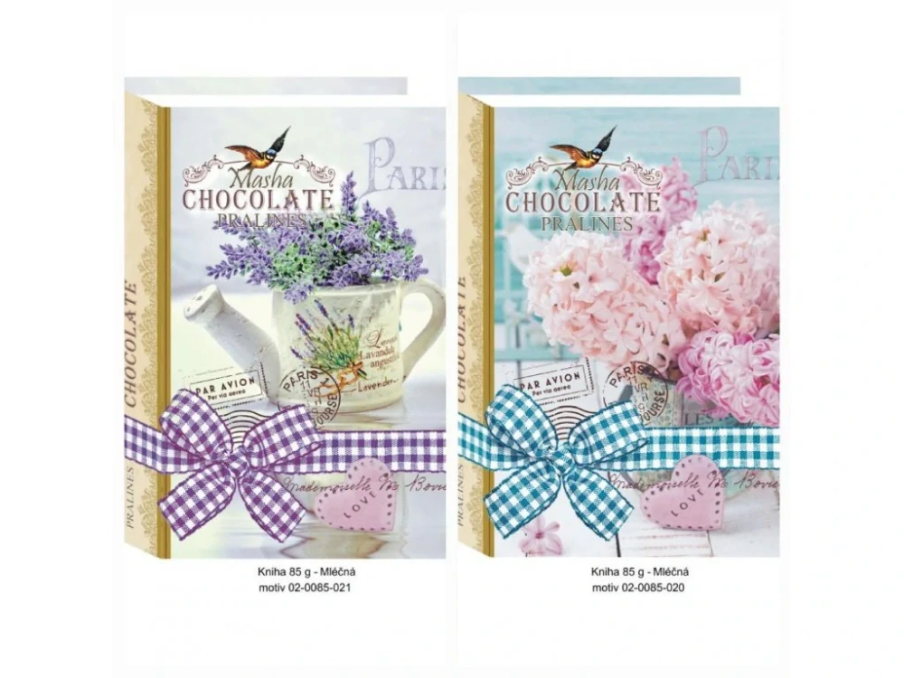 Dopřejte si nádech elegance s touto nádhernou bonboniérou ve tvaru knihy od značky Masha. Uvnitř na vás čekají lahodné pralinky z vysoce kvalitní belgické mléčné čokolády, které okouzlí svou jemnou a bohatou chutí. Bonboniéra je dostupná ve dvou nádherných designech – romantický motiv levandule nebo něžného šeříku. Celek dokonale doplňuje stylová mašle, která dodává balení rustikální a sofistikovaný vzhled.Tato bonboniéra je perfektní volbou pro milovníky jemné mléčné čokolády, kteří ocení nejen lahodnou chuť, ale i estetiku balení. Ideální jako dárek pro každou příležitost, díky květinovému motivu potěší hlavně ženy