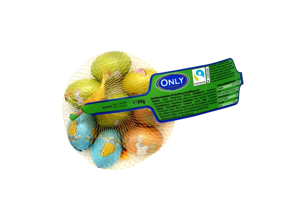 Větší velikonoční vajíčka s lískooříškovou náplní. Čokoládová vajíčka jsou vyrobená z mléčné čokolády. Síťka obsahuje cca 7 kusů vajíček. Barevná čokoládová vajíčka mají obrázky kuřátka, slepičky, motýlka, kachničky a dalších zvířátek. Vajíčka je možná rozdávat koledníkům po jednotlivých kusech