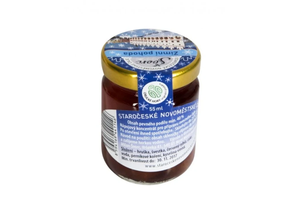 Složení: směs ovoce (švestka, hruška, červený rybíz), cukr, voda, kyselina vinná, perníkové koření