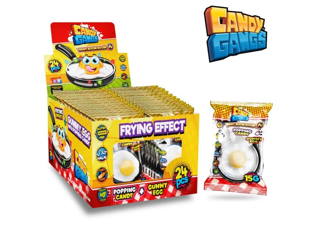 Zažij explozi chuti s originální sladkostí Candy Gangs Eggy Boom Boom! Tato zábavná cukrovinka kombinuje měkké želé ve tvaru volského oka s praskacím cukrem, který ti v ústech vytvoří efekt smažení – „frying effect“.
